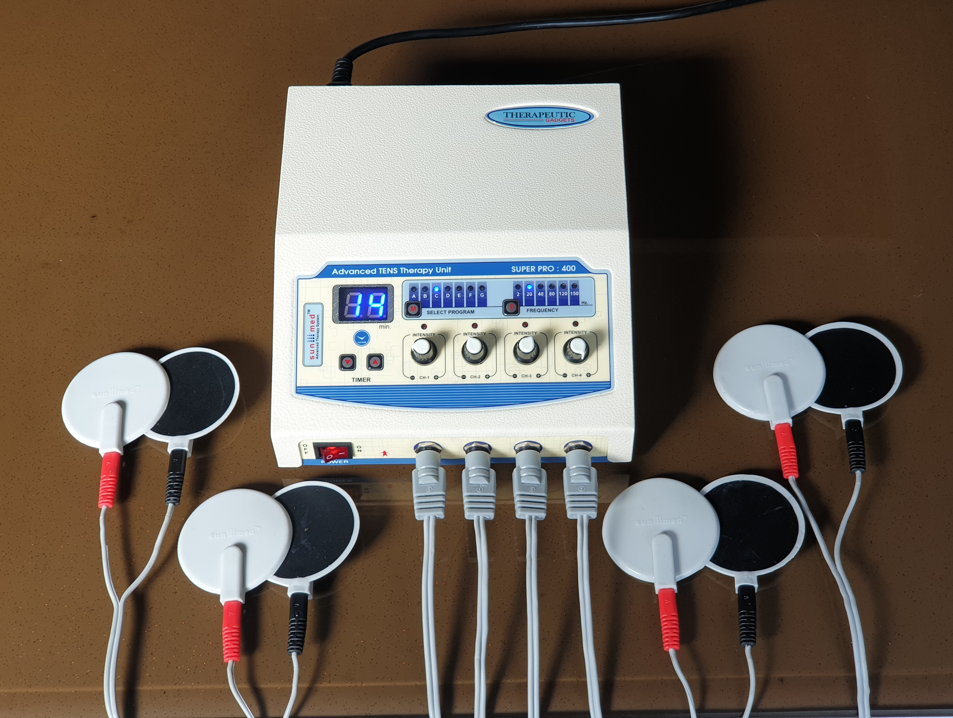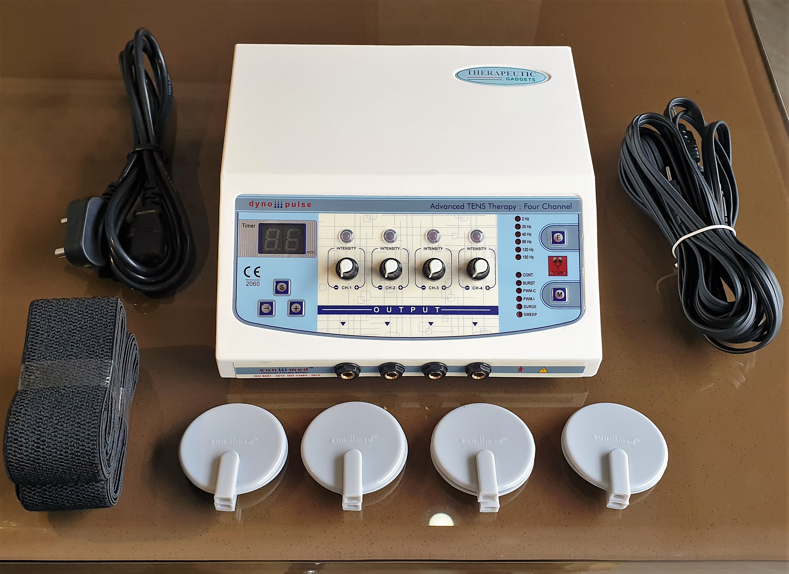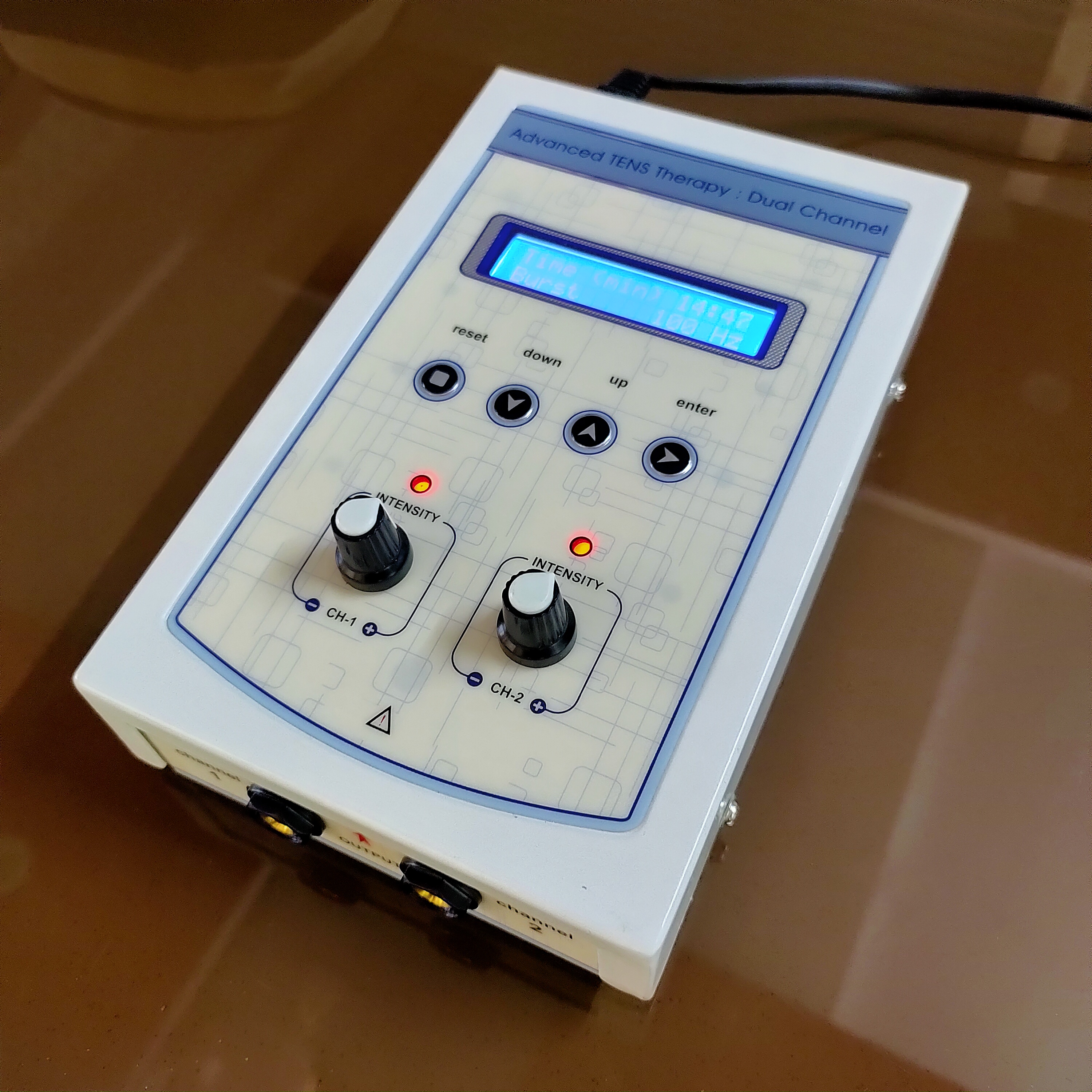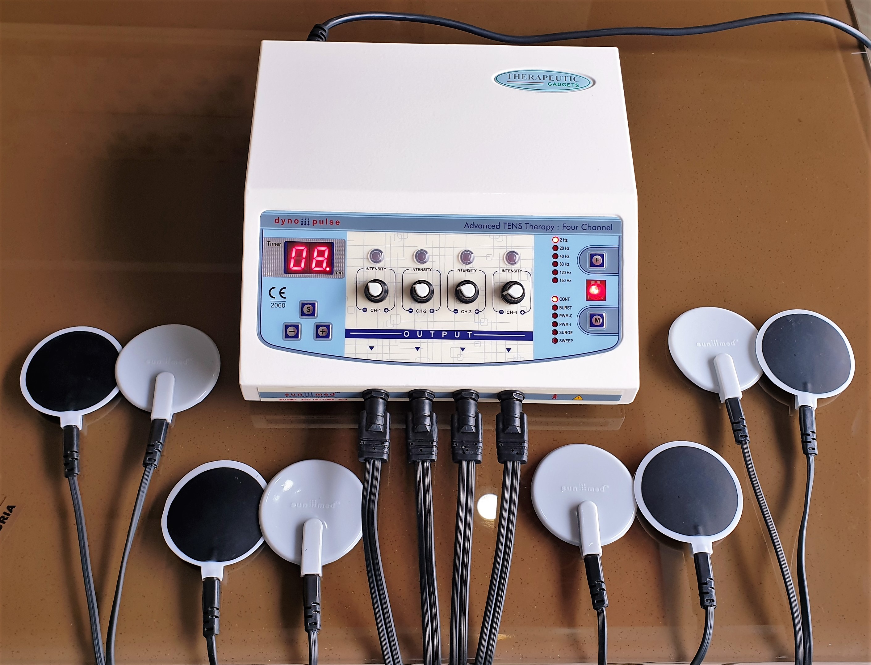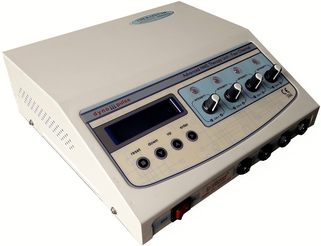 Four independent output channels with indicator 0-80 mA pulse Amplitude on each channel SMPS Supply - Works between 90 to 270 volts. Frequency selection from 0-250 Hz & Pulse Width selection from 100-250 µsec. 5 Pulse modes: Continuous, Sweep, Pulsed, Burst, PWM 128X64 Graphic LCD for ease of use Two independent output channels with indicator 0-80 mA pulse Amplitude on each channel 12 different modes/programs of TENS current to tackle many conditions 60 Minutes timer which can be varied within the interface LCD display for easy-to-understand operation Audio buzzer at end of treatment & for safety output control Light weight for Portability Especially made for personal use
