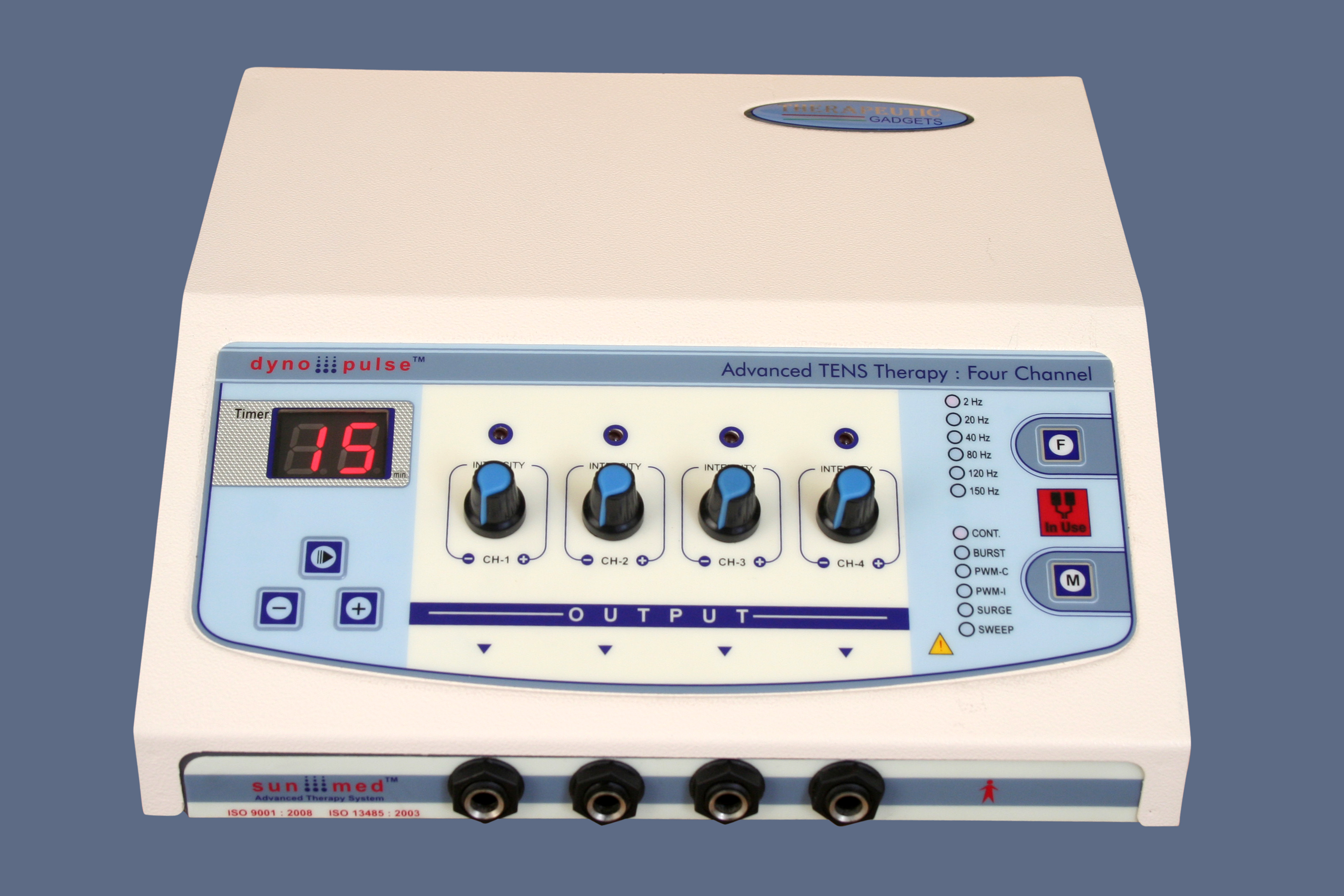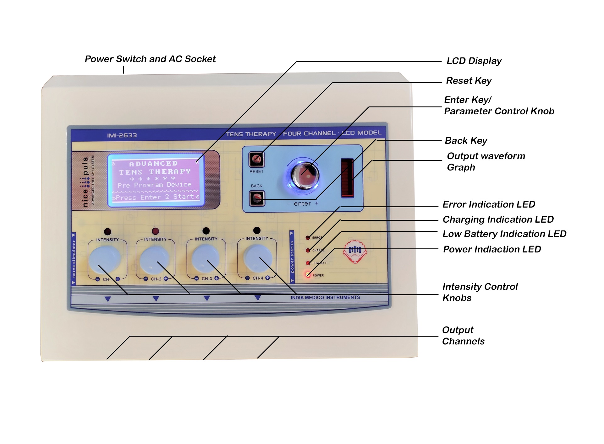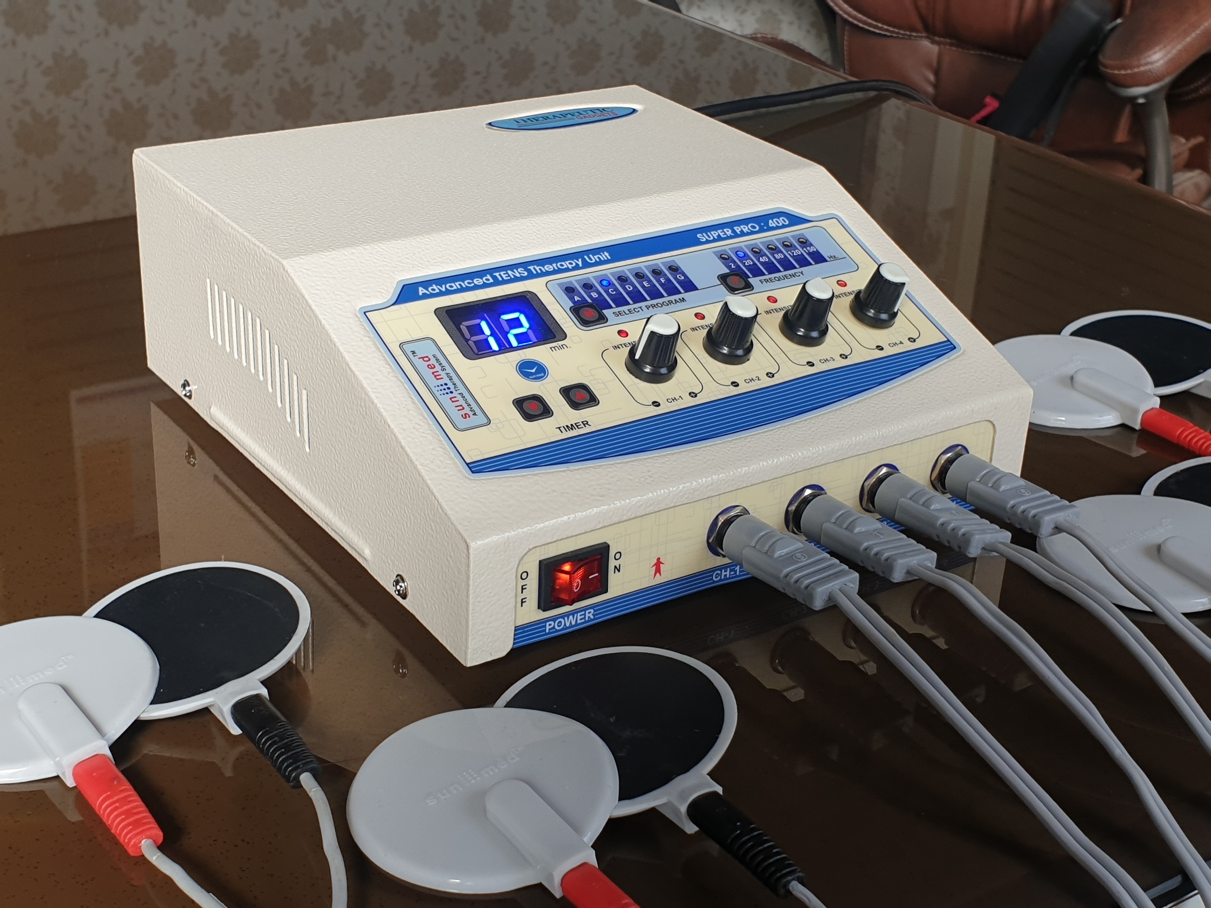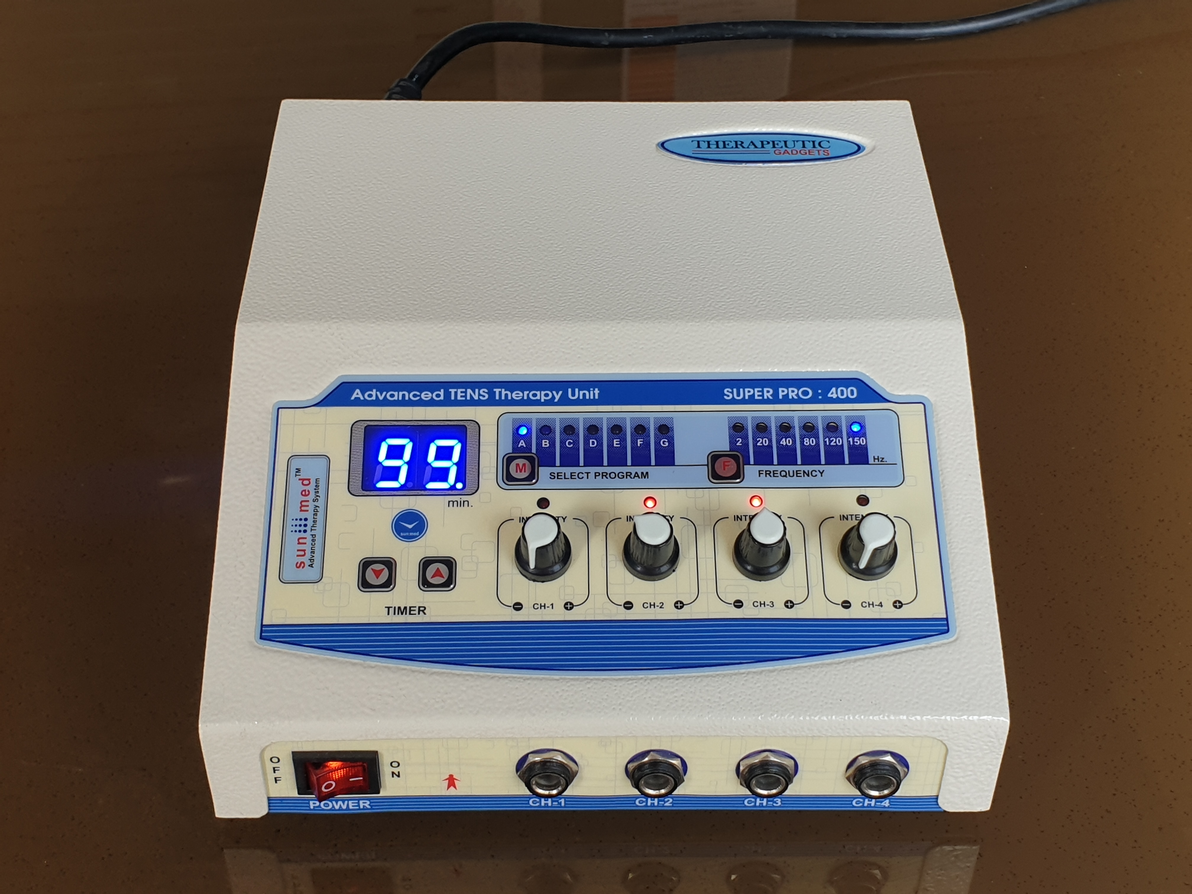Four independent output channels with indicator 0-80 mA pulse Amplitude on each channel SMPS Supply - Works between 90 to 270 volts. Frequency selection from 0-250 Hz & Pulse Width selection from 100-250 µsec. 5 Pulse modes: Continuous, Sweep, Pulsed, Burst, PWM 128X64 Graphic LCD for ease of use Two independent output channels with indicator 0-80 mA pulse Amplitude on each channel 12 different modes/programs of TENS current to tackle many conditions 60 Minutes timer which can be varied within the interface LCD display for easy-to-understand operation Audio buzzer at end of treatment & for safety output control Light weight for Portability Especially made for personal use