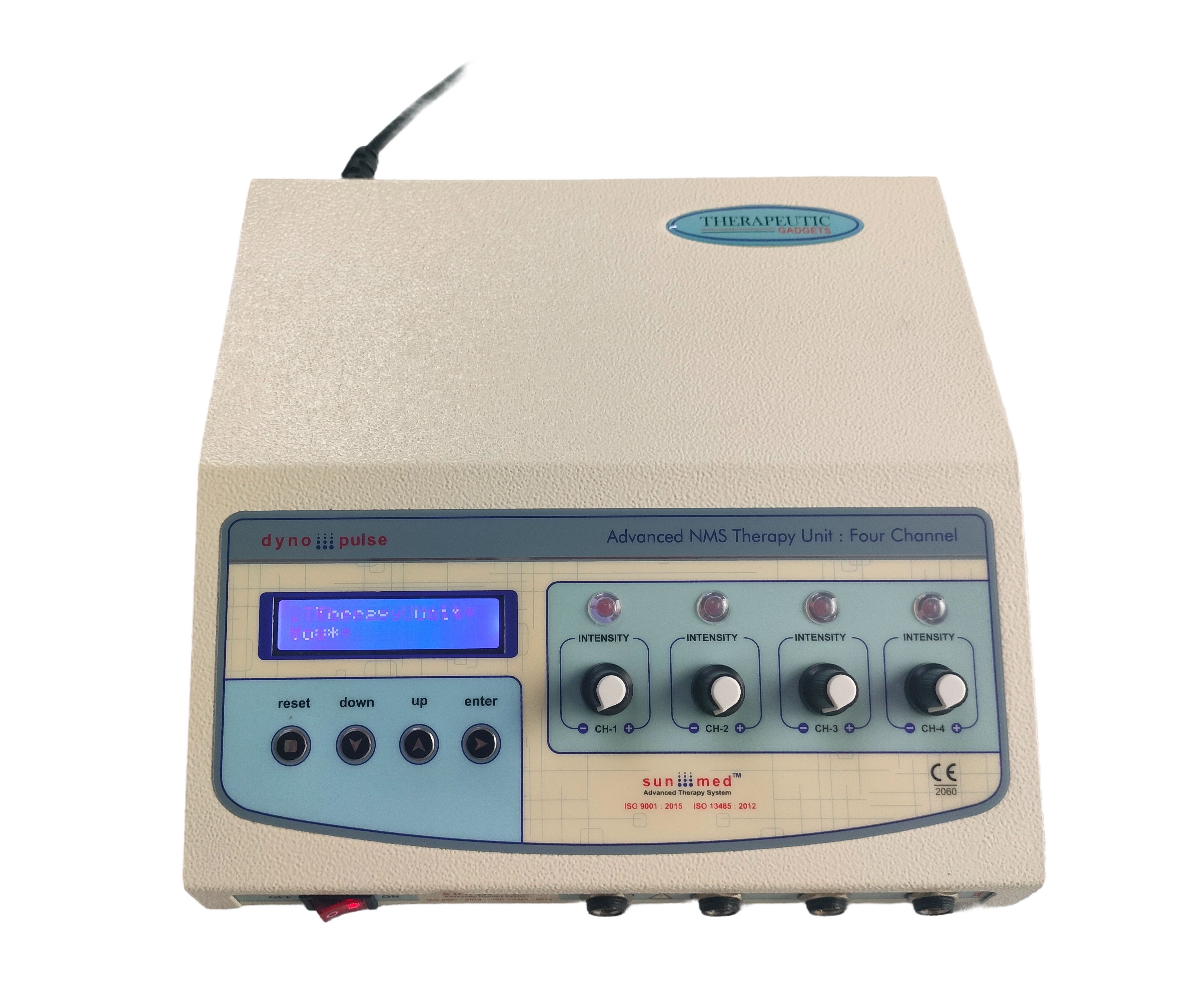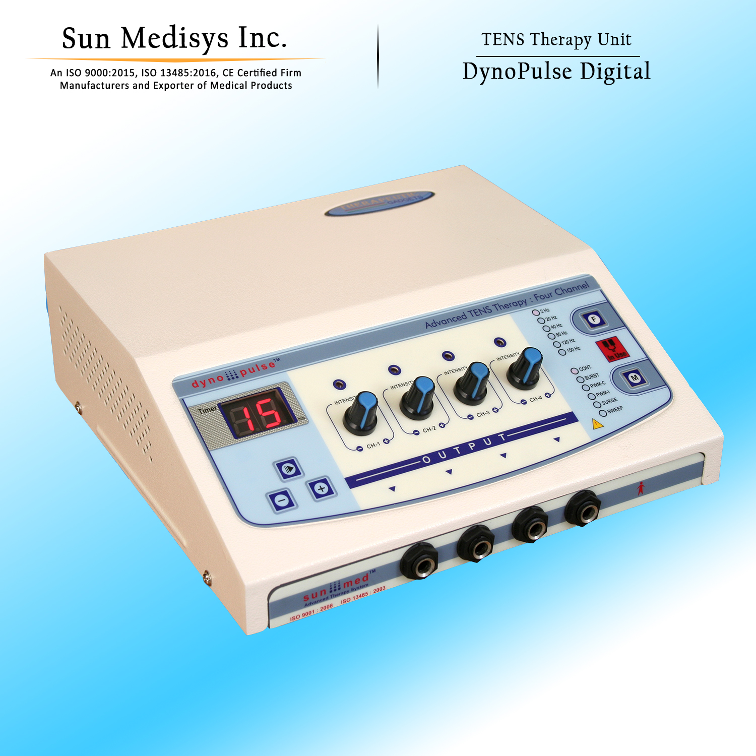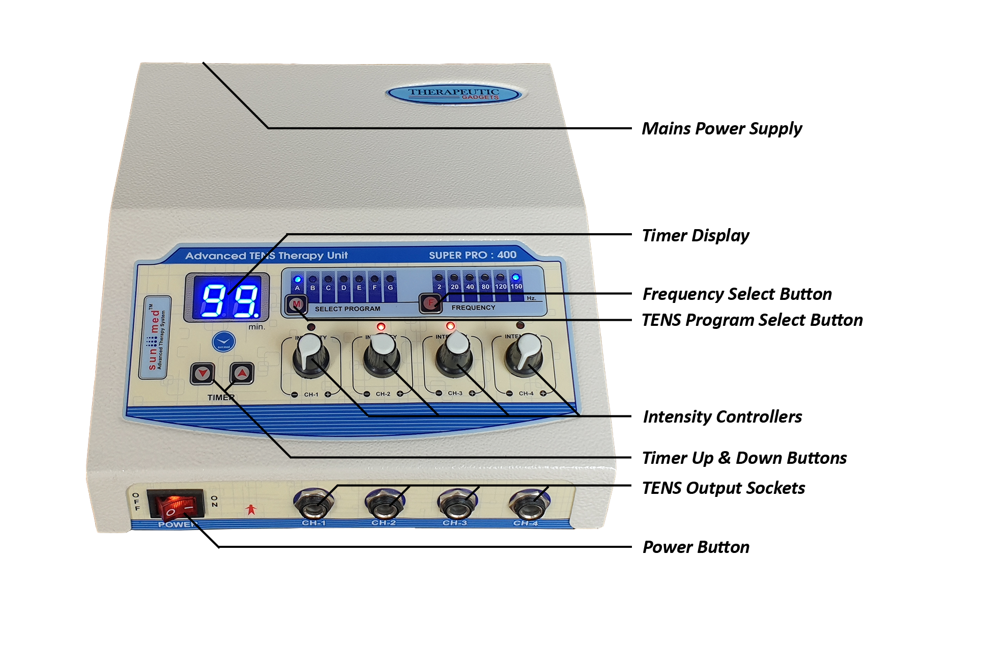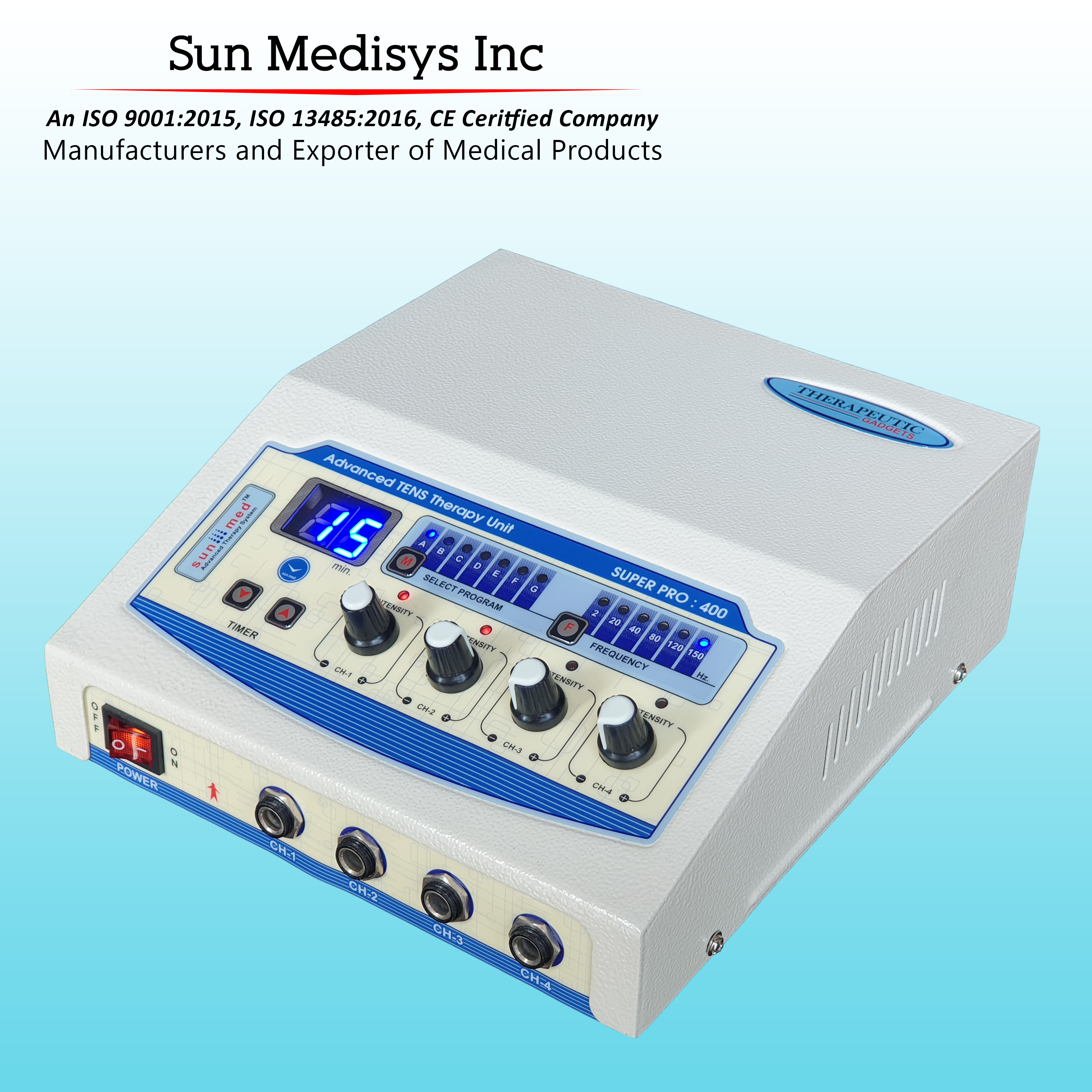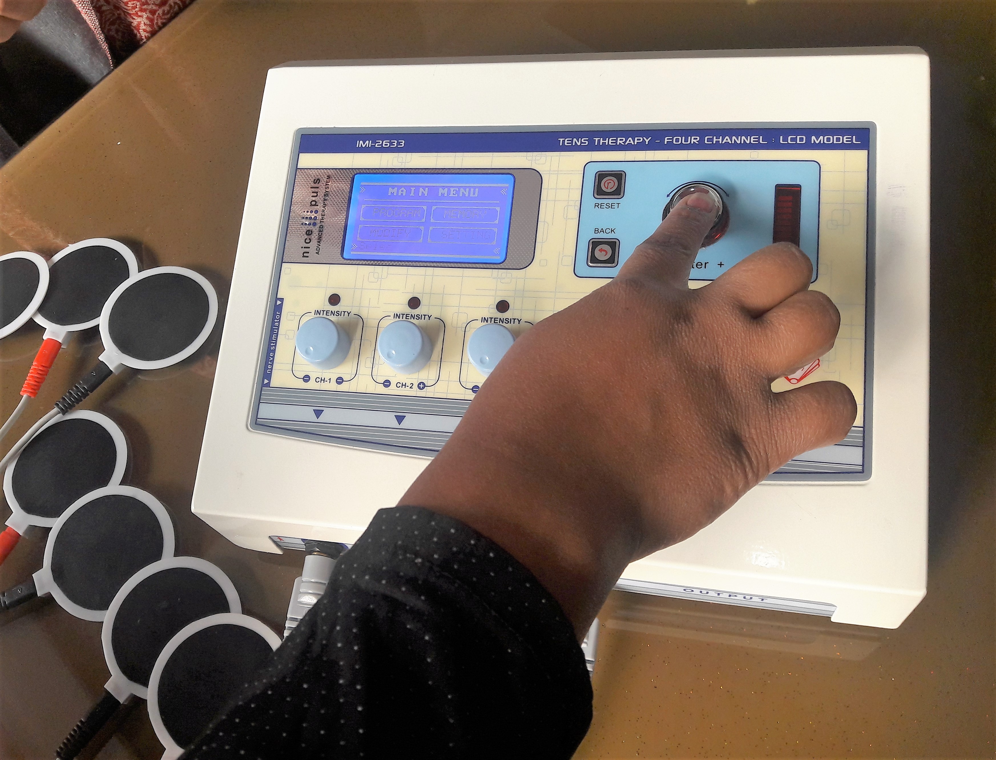 Four independent output channels with indicator 0-80 mA pulse Amplitude on each channel SMPS Supply - Works between 90 to 270 volts. Frequency selection from 0-250 Hz & Pulse Width selection from 100-250 µsec. 5 Pulse modes: Continuous, Sweep, Pulsed, Burst, PWM 128X64 Graphic LCD for ease of use Two independent output channels with indicator 0-80 mA pulse Amplitude on each channel 12 different modes/programs of TENS current to tackle many conditions 60 Minutes timer which can be varied within the interface LCD display for easy-to-understand operation Audio buzzer at end of treatment & for safety output control Light weight for Portability Especially made for personal use